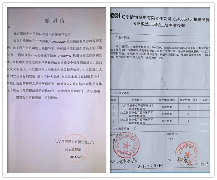 在公司總部的正確領(lǐng)導(dǎo)下,經(jīng)過(guò)清河EPC旁路改造項(xiàng)目部全體成員的共同努力,7月18日,遼寧清河發(fā)電有限責(zé)任公司業(yè)主代表在竣工資料交接證書(shū)上簽字,標(biāo)志著我公司承擔(dān)的遼寧清河電廠(chǎng)2*600MW機(jī)組脫硫取消旁路改造工程正式竣工驗(yàn)收,成功打響了我司在中國(guó)電力投資集團(tuán)的第一槍。