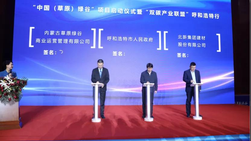 盤(pán)古智庫(kù)秘書(shū)長(zhǎng)、中美綠色基金CEO王俊灃,呼和浩特市副市長(zhǎng)張永文、北新建材董事長(zhǎng)王兵進(jìn)行三方簽約